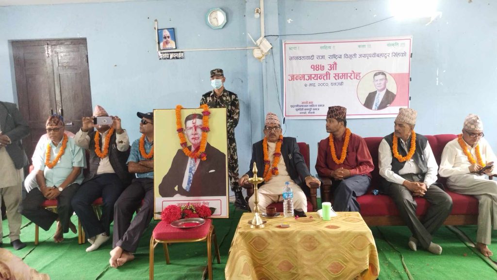 धनगढी, भदौ ७ गते । गोरखापत्र सञ्चालनमा योगदान गरेको मानवतावादी राजा राष्ट्रिय विभूती स्व. जयपृथ्वीबहादुर सिंहको १४७ औँ जन्मजयन्ती मनाइएको छ । विहीबार सुदूरपश्चिम साहित्य समाज र सुर्मादेबी बझाङगी समाजको संयुक्त आायोजनामा मानवतावादी राजा राष्ट्रिय विभूती स्व. जयपृथ्वीबहादुर सिंहको १४७ औँ जन्मजयन्ती मनाइएको हो ।