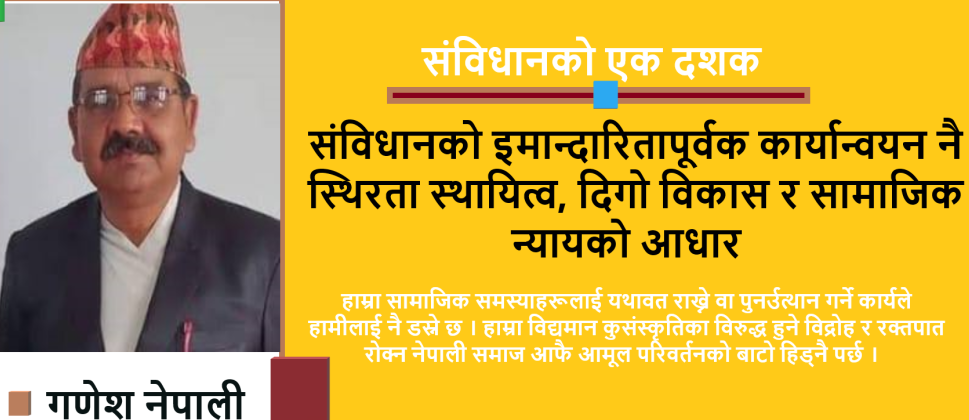 समाजमा आमूल परिवर्तन नहुदा सम्म मान्छेमा पनि परिवर्तन हुदैन । त्यसैले समाज परिवर्तन पनि व्यवस्था परिवर्तन संगै हु जरूरी छ । सामाजभित्रको परिवर्तन समाजले आफै गर्नु उत्तम हुन्छ । जति ढिलो ग¥यो त्यति नै देश र समाजलाई नोक्सान हुँदै जान्छ भन्ने पाठ समाजले सिक्न जरुरी छ । समाज र सरकारका प्रत्येक जिम्मेवार व्यक्तिले संविधानको कार्यान्वनमा जालझेल नगरेर इमान्दारितापूर्वक नलाग्दा सम्म संविधानको आत्मा र मूल मर्म बाच्न सक्दैन् । उपेक्षित, उत्पीडितको पक्षमा संविधानको इमान्दारितापूर्वक कार्यान्वयन नै स्थिरता, स्थायित्व, दिगो विकास र सामाजिक न्यायको आधार हो ।