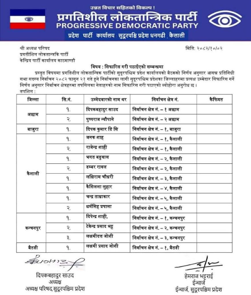 त्यसैगरी प्रगतीशील लोकतान्त्रीक पार्टीका सुदूरपश्चिम प्रदेश सह ईन्चाज हरी तिमील्सेनाले बाजुरा जिल्ला निर्बाचन क्षेत्र नम्बर १ मा दिपक कुमार डि सि र बैतडी निर्बाचन क्षेत्र नम्बर १ मा लक्ष्मी प्रसाद जोशीलाई सिफारिस गरिएको जानकारी गराए ।