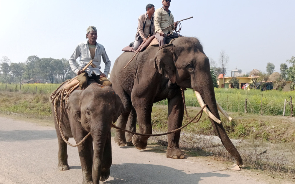 शुक्लाफाँटा निकुञ्जको पिपरैया स्थित हात्तीसारमा रहेकी अढाई वर्षकी शुक्लाकली हात्तीलाइ तालिम दिइैदै