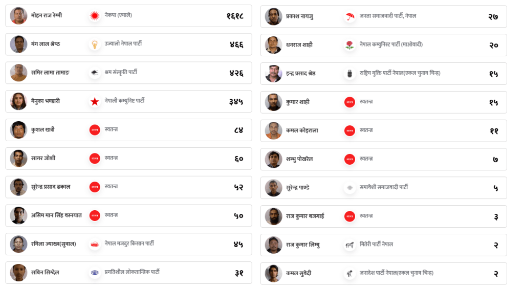 त्यसैगरी उज्यालो नेपाल पार्टीका मंग लाल श्रेष्ठले ४ सय ६६ मत, श्रम संस्कृति पार्टीका समिर लामा तामाङले ४ सय २६ मत, नेपाली कम्युनिष्ट पार्टीकी मेनुका भण्डारीले ३ सय ४५ मत। लगायतका दलीय उम्मेदवारहरूले जमानत जोगाउन सकेनन । नेपाल मजदुर किसान पार्टी, जनता समाजवादी पार्टी र नेकपा माओवादी जस्ता दलका उम्मेदवारको मतसमेत सयको आँकडा पार हुन सकेन ।