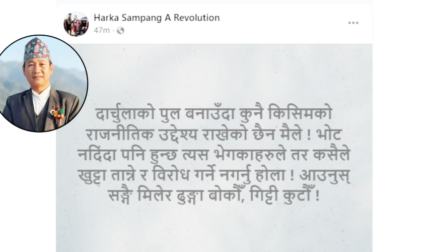 उनले सामाजिक सञ्चाल फेसबुकमा दार्चुलाको पुल बनाउँदा कुनै किसिमको राजनीतिक उद्देश्य नराखेको उल्ले गर्दै भोट नदिँदा पनि हुन्छ तर कसैले खुट्टा तान्ने र विरोध गर्ने नगर्नु होला ! आउनुस् सङ्गै मिलेर ढुङ्गा बोकौँ, गिट्टी कुटौँ !’लेखेका छन ।